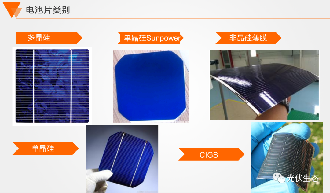 太阳能电池分为硅(silicon)太阳能电池(单晶硅、多晶硅、sunpower)、非晶体硅(cigs)等,目前使用最多的是高效能单晶硅,转化效率在22%—25%之间。