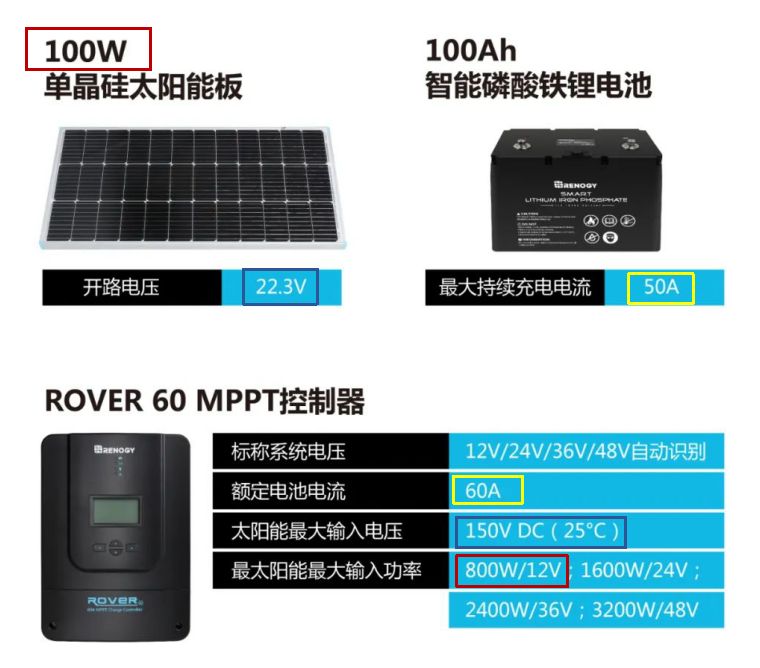 · 控制器输出端接电池,在控制器选型的时候,控制器输出的电流值不能超过电池允许的最大充电电流值,RVR60的额定电池电流是60A,接入的锂电池必须要大于或等于60A。RENOGY的12V100Ah锂电池最大持续充电电流是50A,搭配RVR60的话至少需要2块锂电池并联