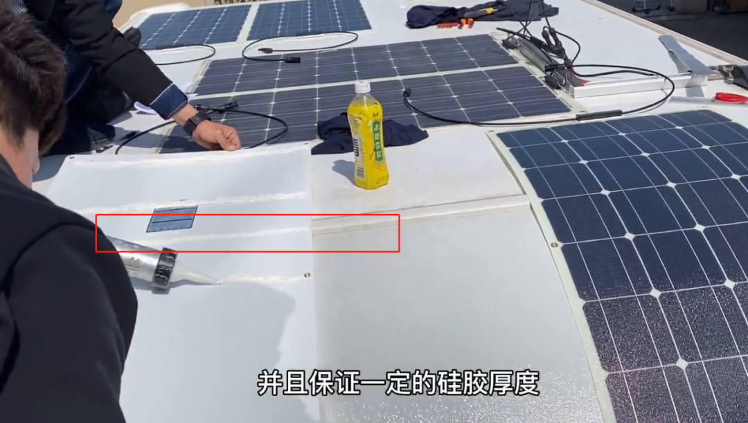 3、太阳能板尾部外露处,还需要注意打胶的美观性。助理小哥给硅胶沾点水可以让硅胶凝固得更快,用手指抹平硅胶,是为了保障硅胶的平整光滑。
