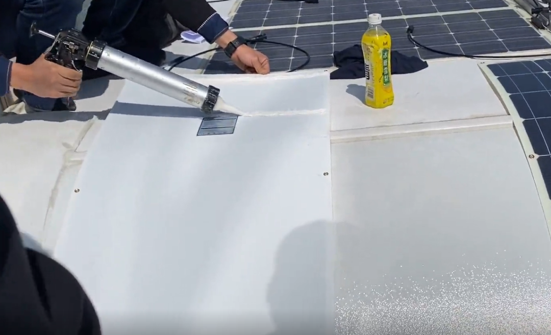 1、在柔性太阳能板的背面打上硅胶,然后粘在车顶。玻璃硬板是使用安装支架固定在车顶,所以相比于玻璃硬板的安装方式,柔性板的散热不如玻璃硬板。为了尽可能减少散热导致的发电效率问题,我们的技术工程师在安装时会横向均匀得给柔性板打上一条条硅胶,并且保证一定的硅胶厚度,这样便可以在柔性板的背面留下一条条通风小道,有助于散热。