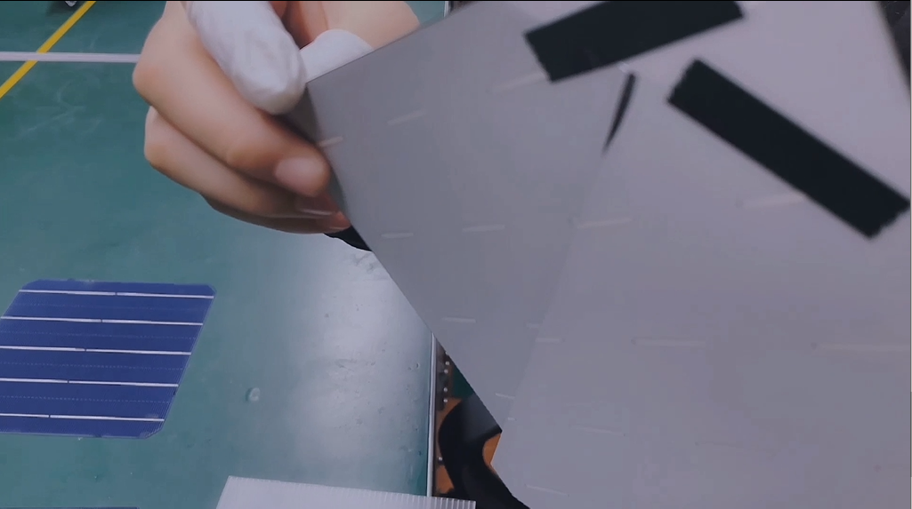 C级电池片主要是一些回收电池片,可能会有崩边、大面积虚印、栅线脱落、严重沾污等问题,如下图中的这块胶片电池,表面上看是没有任何问题的,但我们看一下背面,其实是用胶带粘连起来的,当它和玻璃面板层压在一起后,肉眼是完全分辨不出任何问题的。