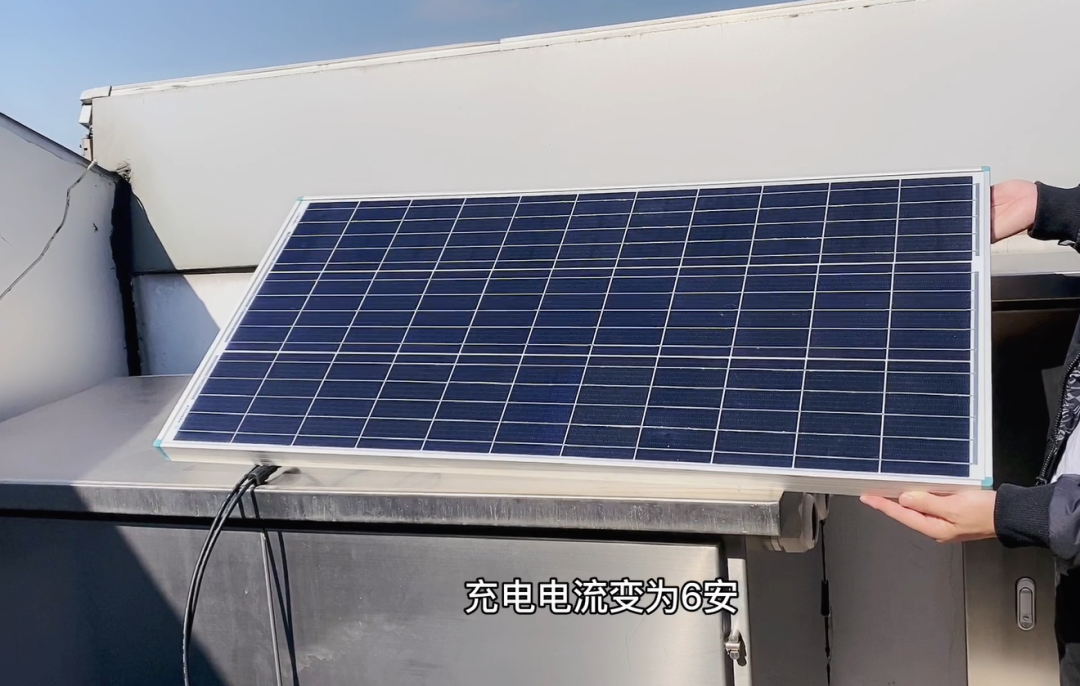 一、太阳能板先平铺放置,阳光满满的洒在上面!我们的控制器界面显示的数据,充电电压13.1V,充电电流4.9A,控制器端输出功率为64.19W,我们使用的是MPPT控制器,转换率高达95%以上,太阳能电池板端的充电功率会大于64.19W。