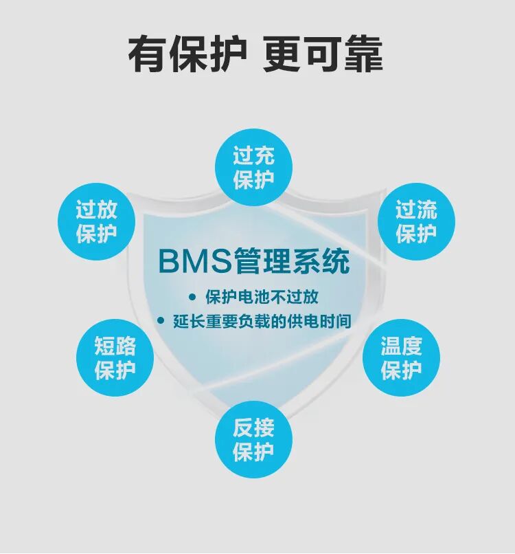 欠压保护:单块电芯电压低于2.5V时,电池自动进入保护模式,恢复到3.1V时继续正常工作;