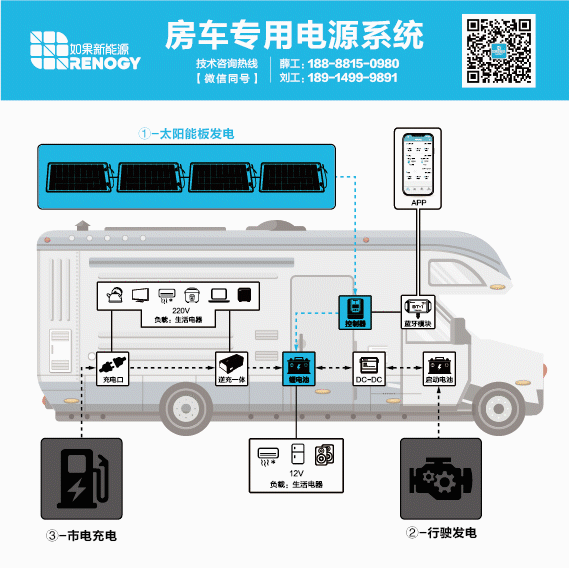 RENOGY如果新能源,提供房车专用电源系统,更好地保障房车生活用电的安全、高效、稳定。RENOGY如果新能源房车专用电源系统包括高效太阳能电池板,MPPT充电控制器、智能磷酸铁锂电池,稳定逆充一体机、直流-直流双电池充电器、智能APP等,可实现行车充电、太阳能充电、市电充电的三种供电方式,满足你的用电储能需求。所涉及的发电-输电-充电-存电-逆变-配电-用电七大模块匹配兼容,智能调节充放电逻辑,提供过充及过放保护,确保电源系统的安全稳定。