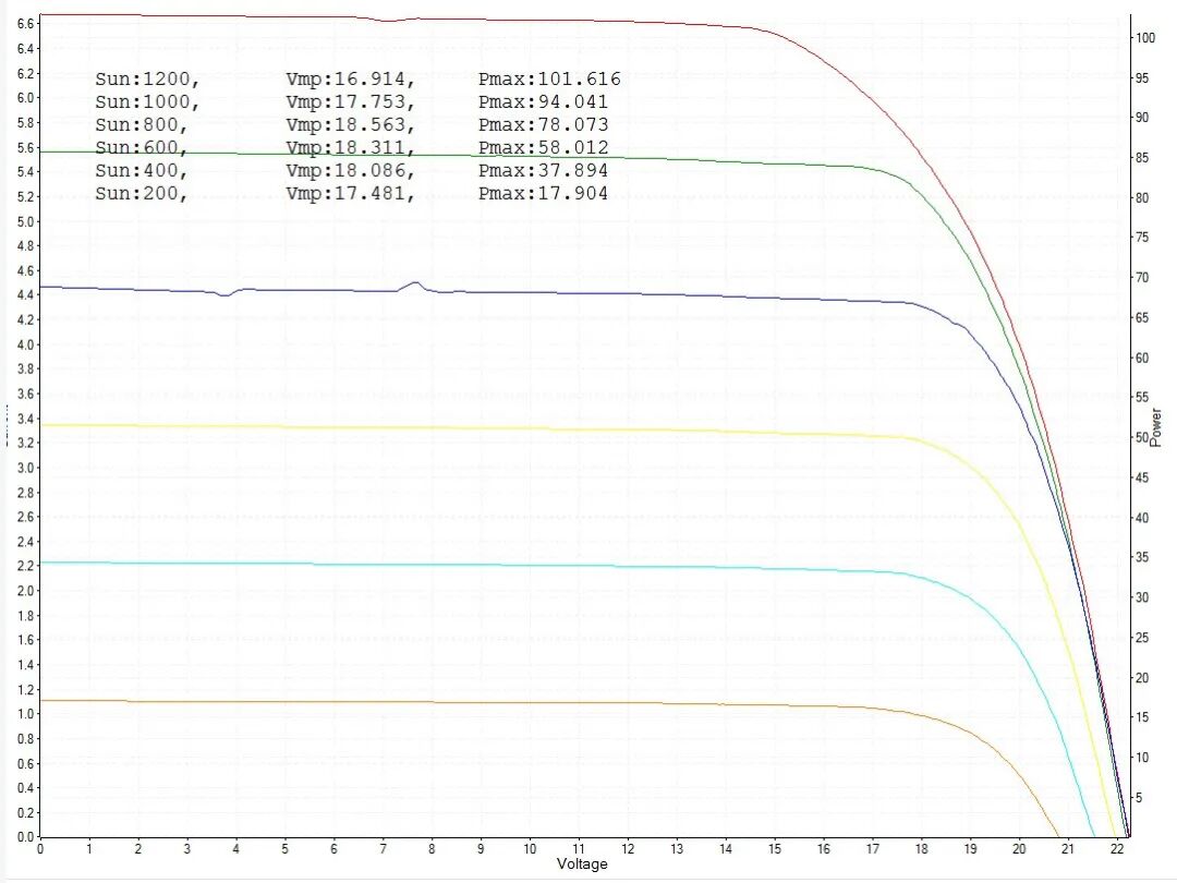 第二是光照强度,通过下图实验数据可以更直观的感受到。下图中,不同颜色分别代表不同的光照强度,同一太阳能板在不同的光照强度下输出的功率有所差异。如:1200勒克斯的光照强度下太阳能板的最大输出功率约为101w,而200勒克斯的光照强度下的最大输出功率只有大约17w,足足差了5倍多,从图中也可以看到,光照强度越大,太阳能板的工作电流越大;