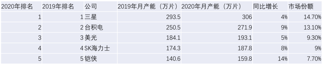 但8寸晶圆的产能却远跟不上需求增长的速度,甚至8寸晶圆厂在逐年关闭。在中国大陆来说,芯片项目在技术先进性上的导向以及盈利,很多项目在落地时就瞄准了12寸产线,还有一些8寸产线转成12寸产线。根据第三方数据机构IC Insights统计,三星电子2020年底月产能为306.0万片8寸晶圆,位居第一大厂,其次为台积电。