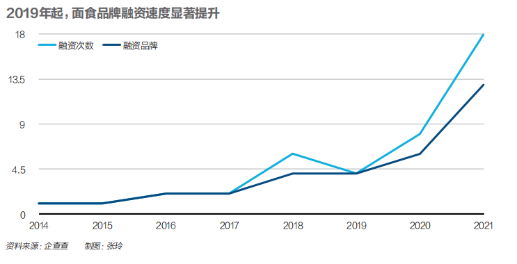 资本对面馆的兴趣不仅仅在兰州牛肉面。近三年来,传统的面食领域投融资速度明显加快。根据企查查数据,2014年至今,速食面、实体面馆等面类品牌一共发生42起融资事件。其中,前三年每年仅发生1起-2起融资事件;2018年开始急速增长至6起,2021年截至发稿,融资事件已经发生了18起,同比增长125%。