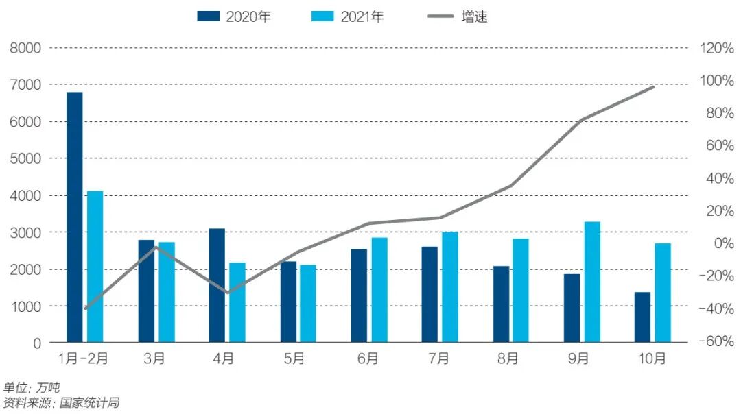 从煤炭供给方面看,据国家统计局数据,1月-10月全国规模以上企业原煤产量33亿吨,同比仅增长了4%。即便10月开始保供增产,前十个月,原煤产量增速远远低于用电量增速,缺口非常明显。