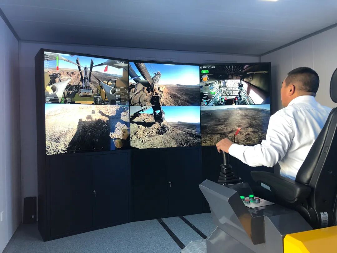 10月21日,国家电投内蒙古能源公司南露天煤矿工程师正在室内远程操作矿场无人驾驶挖掘机进行采矿作业。摄影|韩舒淋