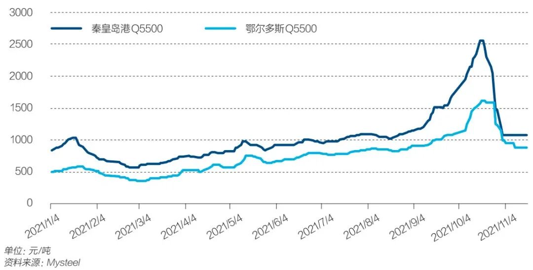 受诸多供需偏紧因素叠加影响,今年的煤价,始终在高位区间运行。秦皇岛港Q5500动力煤价格,除了在今年2月回落至570元/吨,其余时间均在高位,并在9月突破历史高点。到了10月中旬,则飙升至2600元/吨左右的峰值。