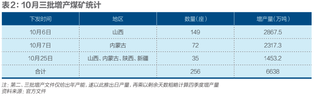 根据10月官方下发的三批增产文件测算,四季度全国参与增产的煤矿共有256座,增产量约6638万吨。其中,山西、内蒙古承担了94%的任务。