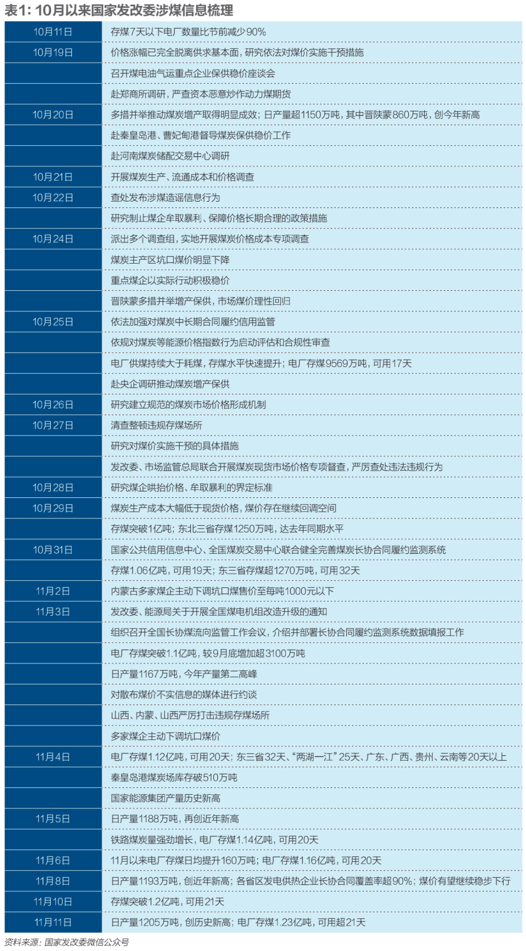 据《财经》记者不完全统计,10月19日至11月11日,国家发改委官微密集发布了40条以上煤炭相关信息,主要涉及煤炭市场增产稳价调控政策、原煤产量、电厂存煤、可用天数等关键指标。