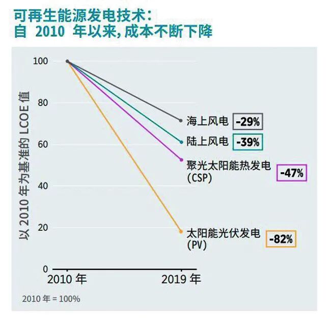 过去十年,光伏和风电的度电成本分别下降了约八成和四成,且仍有进一步下降空间。