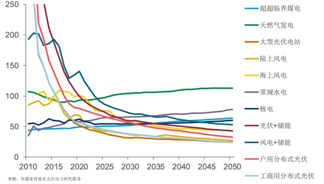 据国际能源咨询公司伍德麦肯兹近期发布的报告,未来十年,火电的成本还将上升,光伏、风电则有40%—50%的成本下降空间。2035年是一个分水岭,届时中国所有可再生能源发电的成本都将比煤电低。如果再加上为碳排放支付的费用,煤电成本将高出10%—15%。