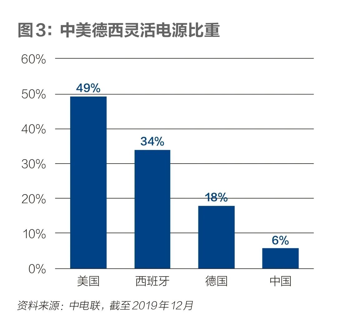 中电联2019年12月发布的《煤电机组灵活性运行政策研究》显示,欧美国家的灵活电源比重普遍较高,西班牙、德国、美国占比分别为34%、18%、49%,而中国占比不到6%。在中国新能源资源富集的三北地区,风电、太阳能发电装机分别占全国的72%、61%,但灵活调节电源还不足3%。