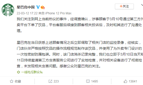 星巴克在当日获悉上述顾客情况之后立即调取了相关门店的监控录像,经核实,门店伙伴严格按照饮品的操作流程规范制作该饮品,并使用了为外卖专门设计的一次性密封防漏包装。同时,该门店消杀记录完整,我们也立即于3月10日当天和11日持续邀请第三方虫害服务公司进行了实地检查,并对相关设备进行了彻底检查,未发现相关虫害问题。感谢公众对星巴克的关注。