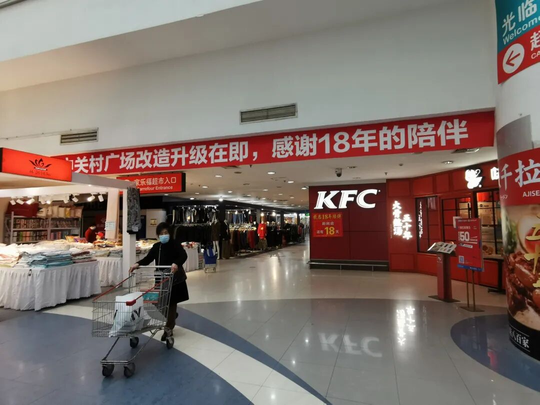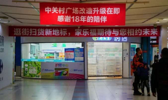 近日,记者来到家乐福超市的入口,沿途还能看到新挂出的横幅:“中关村广场改造升级在即,感谢18年的陪伴。”