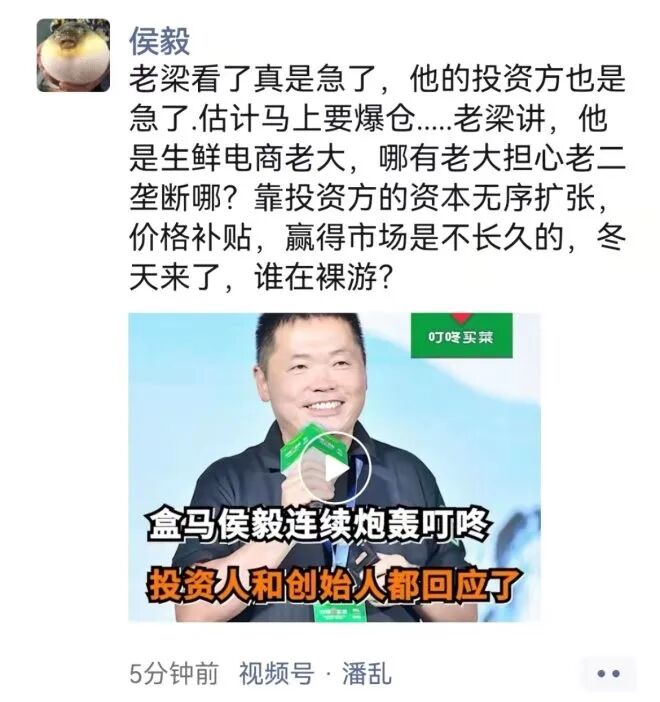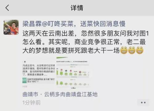 对此,侯毅在朋友圈隔空回应称:“老梁看了真是急了,他的投资方也是急了,估计马上要爆仓……老梁讲,他是生鲜电商老大,哪有老大担心老二垄断”。