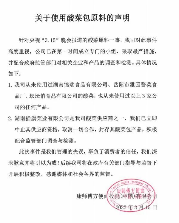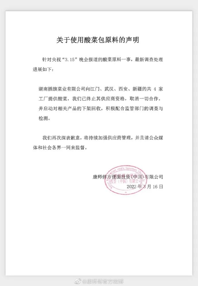 16日凌晨,康师傅方便面投资(中国)有限公司发布声明称:湖南插旗菜业有限公司是我司酸菜供应商之一,已立即中止其供应商资格,取消一切合作,封存其酸菜包产品,积极配合监管部门调查与检测。