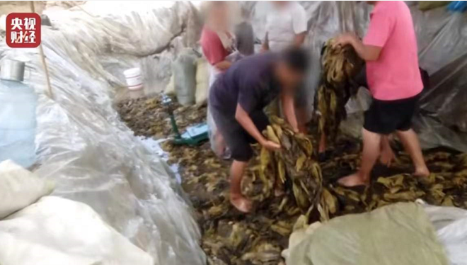 工人们有的穿着拖鞋,有的光着脚,踩在酸菜上,有的甚至一边抽烟一边干活,抽完的烟头直接扔到酸菜上。而这些酸菜在被插旗菜叶收购时,插旗菜业并不对卫生指标进行检测。