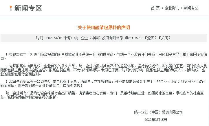 3月15日当晚,统一公司在官网发布声明称,最近五年内,湖南插旗公司已不再是公司酸菜包原料的供应商,同时,已于第一时间约谈了湖南锦瑞公司(另一家被曝光的酸菜加工企业)的负责人,对相关的酸菜包产品已全部进行了封存,并在市场监管局的参与下一起进行质量检测。