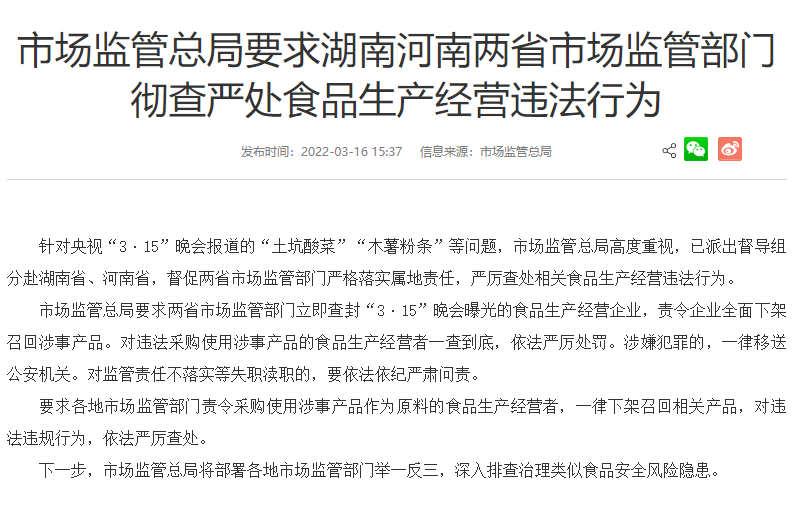 “3·15”晚会曝光湖南插旗菜业有限公司加工生产的老坛酸菜存在食品安全问题,随即引发舆论关注。