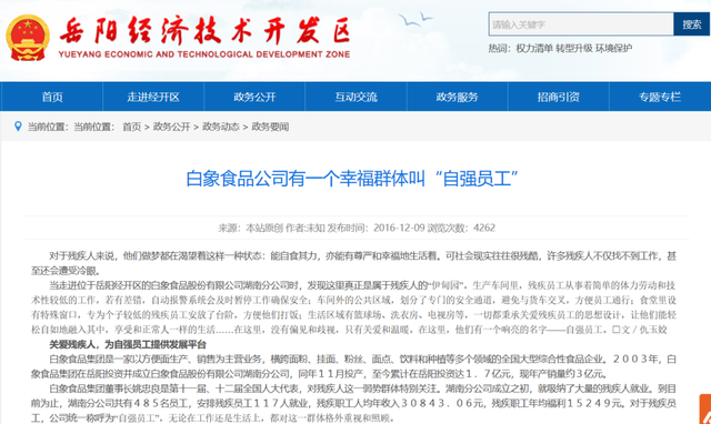 记者查询发现,湖南省岳阳经济技术开发区官方网站曾于2016年12月发表一篇题为《白象食品公司有一个幸福群体叫“自强员工”》的文章,文中提到:(白象食品集团)湖南分公司成立之初,就吸纳了大量的残疾人就业。