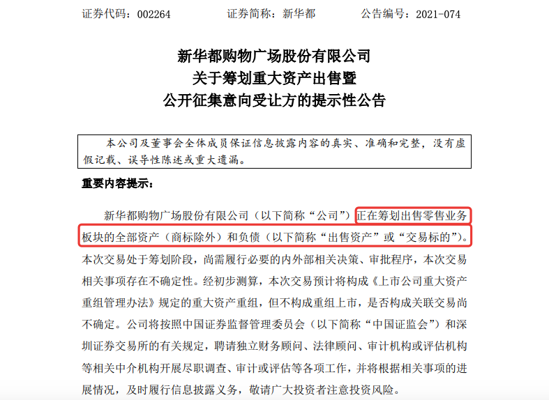 11月24日,新华都(SZ:002264)发布公告称,拟出售零售业务板块的全部资产(商标除外)和负债,包括除互联网营销业务以外的、其他任何与超市百货等零售业务相关的资产及负债。