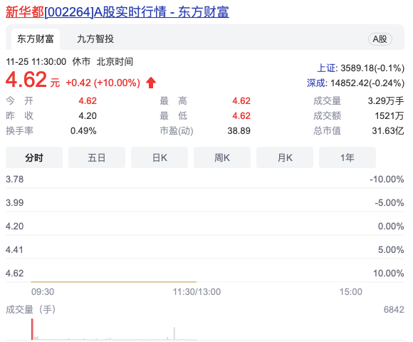 最后,截至11月25日早盘,新华都一字板涨停。截至发稿报4.62元,涨停板封单超25万手。