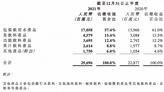 包装饮用水产品的收益为170.58亿元,同比增长22.1%,占总收益的比例为57.4%;