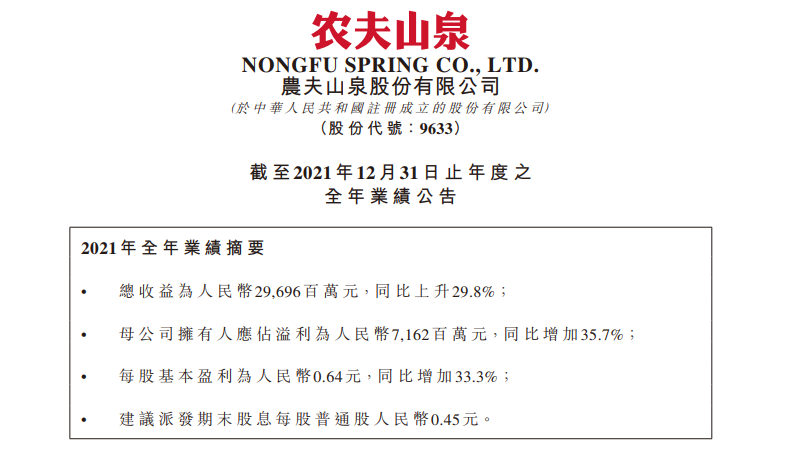 本文来源 | 综合食品板、农夫山泉2021年财报、搜狐财经