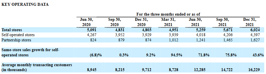 其中,自营门店同店销售增长率达到69.3%,自营门店门店层面利润在2021年首次实现年度转正,达到12.528亿元人民币,2020年同期则为亏损4.347亿元人民币。
