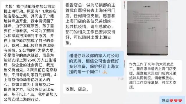 图示:苏浙皖多省的大润发员工主动请战支援上海。