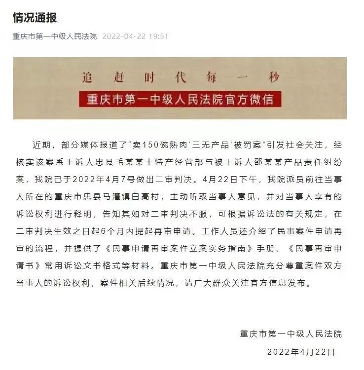 4月22日下午,重庆市第一中级人民法院派员前往当事人所在的重庆市忠县马灌镇白高村,主动听取当事人意见,并对当事人享有的诉讼权利进行释明,告知其如对二审判决不服,可根据诉讼法的有关规定,在二审判决生效之日起6个月内提起再审申请。