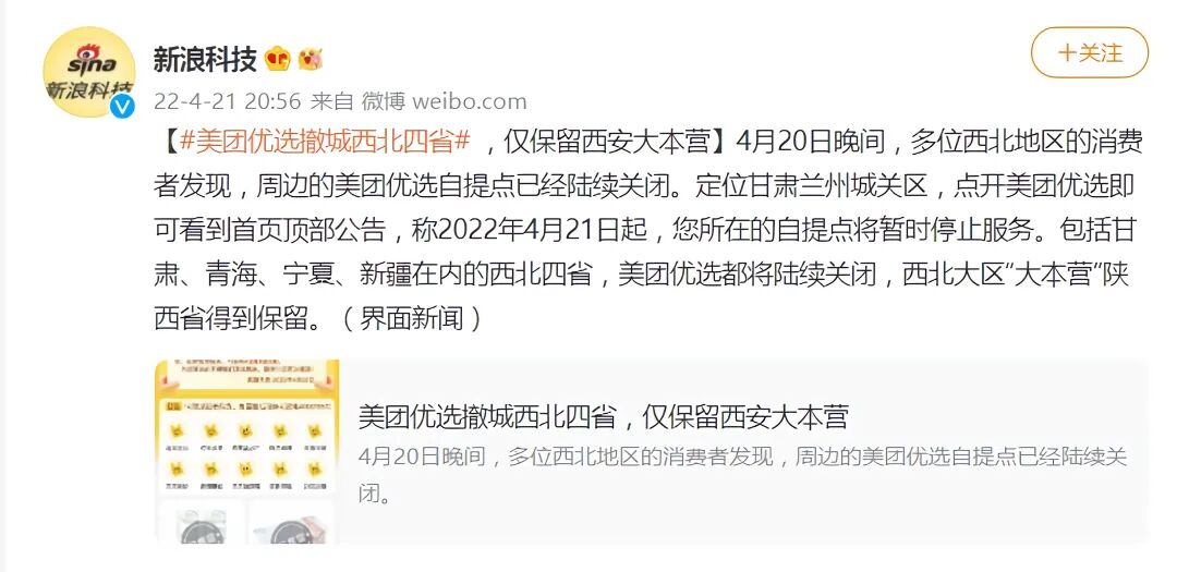 一位行业人士表示,撤城的原因在于运营成本过高,除了西北四省,美团优选在其他地区也将作出小幅调整。