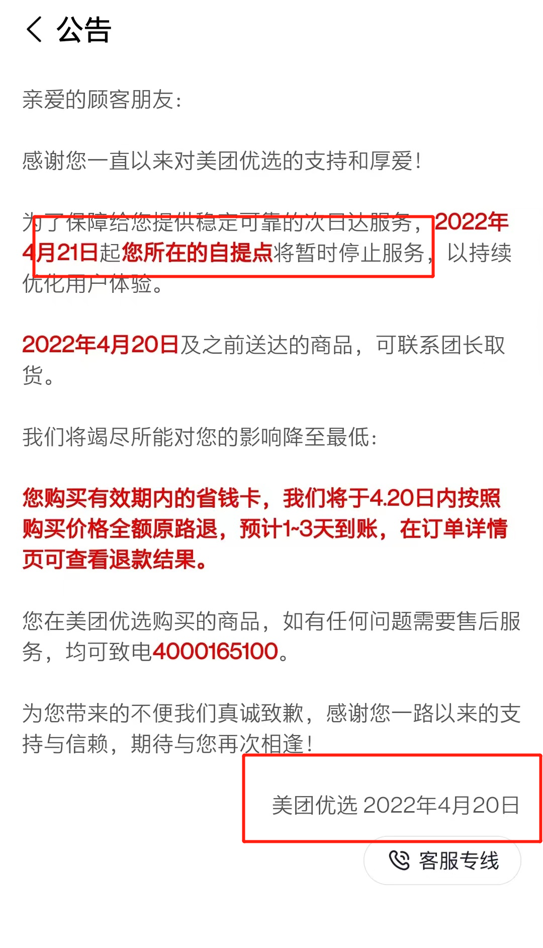 公告称“亲爱的顾客朋友”,从2021年4月21日开始,该自提点将暂时停止服务。