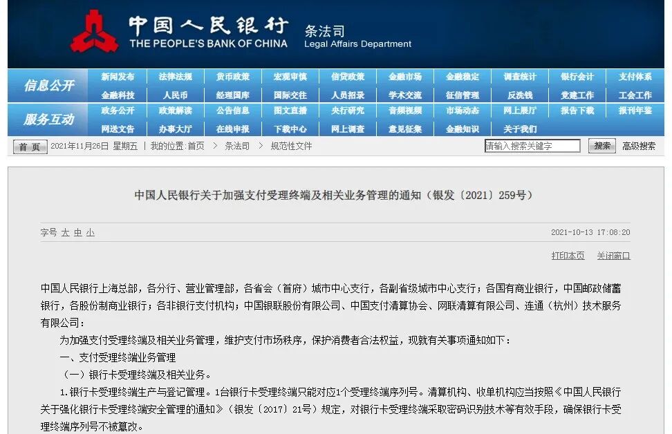 2021年10月13日,央行官网发布《中国人民银行关于加强支付受理终端及相关业务管理的通知(银发〔2021〕259号)》,从支付受理终端业务管理、特约商户管理、收单业务监测三个方面入手,对收单机构和清算结构提出了一系列的管理要求。