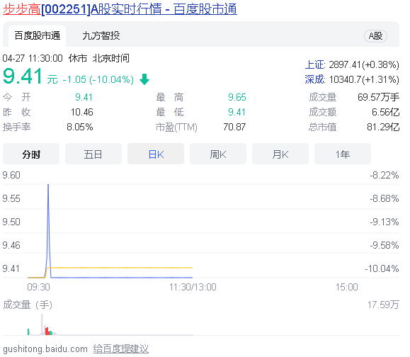 截至4月27日,每股9.41元,下跌10.04%,总市值81.29亿。