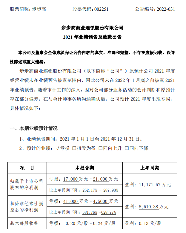 步步高称,随着审计工作的深入,因对公司部分业务活动的会计判断和原预计存在部分偏差,如:金星路广场 REITS 发行投资收益的确认、商誉减值等的会计判断和原预计时的估计存在部分偏差,经会计师沟通确认,公司2021年出现亏损。