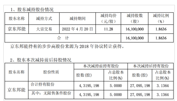 4月21日晚间,步步高披露,4月20日,江苏京东邦能投资管理有限公司(下称“京东邦能”)减持该公司1610万股,平均减持价格11.28元/元,套现约1.8亿元。减持后,京东邦能持股数量从4319.5万股降至2709.5万股,持股比例从5%降至3.1364%。