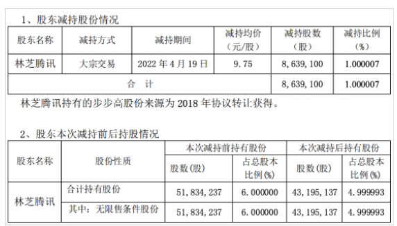而另一战略投资者,腾讯系公司就已大幅减持。4月19日,林芝腾讯科技有限公司((下称“林芝腾讯”)通过大宗交易,减持步步高863.9万股,减持比例 1.000007%,减持均价9.75元/股,减持金额约9500万元。