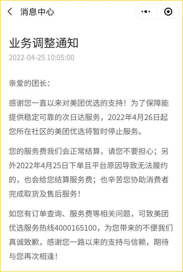 美团优选在首页公告中称:“为了保障给您提供稳定可靠的次日达服务,2022年4月26日起您所在的自提点将暂时停止服务。2022年4月25日及之前送达的商品,可联系团长取货。如需售后服务,可致电4000165100。为您带来的不便我们真诚致歉,期待与您再次相逢!”