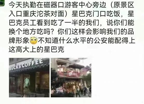 2月,#星巴克驱赶执勤民警#上热搜,位于重庆磁器口的星巴克门店工作人员,以影响品牌形象为由驱赶吃盒饭的民警,并恶意投诉。