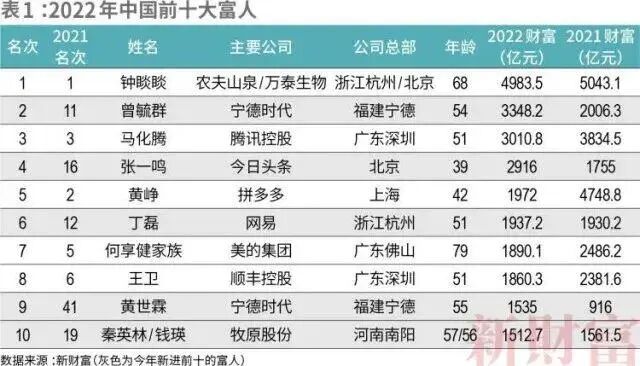 农夫山泉钟睒睒以4983.5亿元财富成功连任首富,牧原股份的秦英林和钱瑛夫妇首度进入榜单前十。