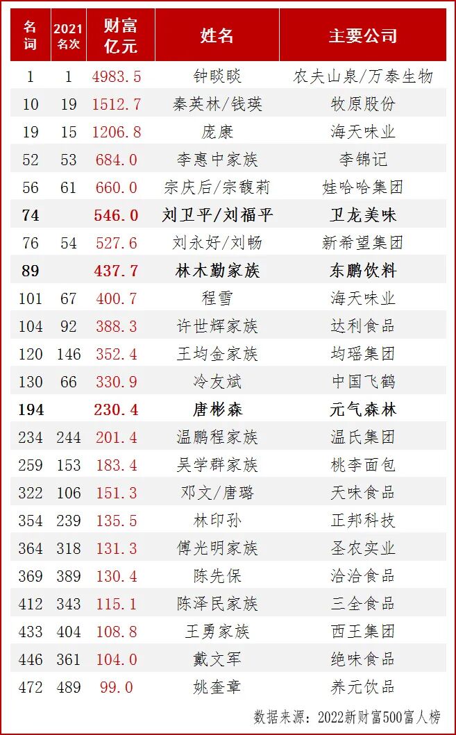 同在消费品领域,卫龙的刘卫平、刘福平兄弟、元气森林的唐彬森、东鹏饮料的林木勤家族也首次上榜。