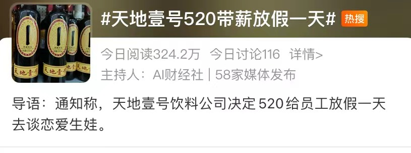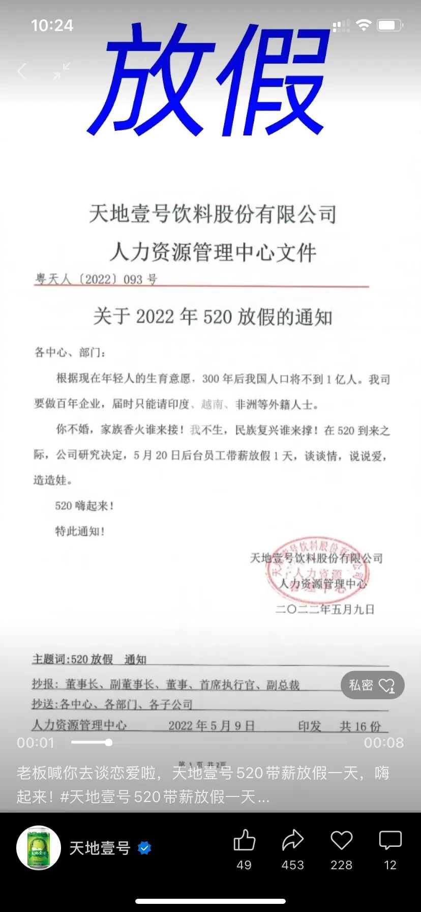 根据天地壹号官方微信公众号发布的通知显示,公司决定“520”那天给员工带薪放假一天,谈谈情,说说爱,造造娃。通知还提到,根据现在年轻人的生育意愿,300年后我国人口将不到一亿人,公司要做百年企业,到时只能聘请外籍人士,“你不婚,家族香火谁来接”。