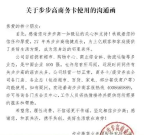 步步高在《关于步步高商务卡使用的沟通函》中首先感谢了商务卡持卡人多年来的关心和支持,并表示近段时间网传有关步步高的谣言很多,公司经营一切正常,商务卡/提货券在各门店、各业态(包括超市、百货、家电、部分餐饮商户等)均能使用。最后,步步高希望大家理性消费,不信谣不传谣。
