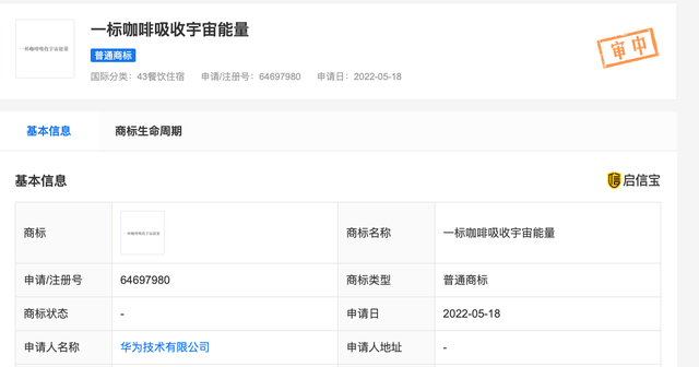近日,华为技术有限公司申请注册“一标咖啡吸收宇宙能量”(下称“一标咖啡”)商标,国际分类为餐饮住宿,当前商标状态为等待实质审查。