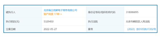 企查查显示,5月27日,北京每日优鲜电子商务有限公司被北京市朝阳区人民法院列为被执行人,执行标的532.95万元。