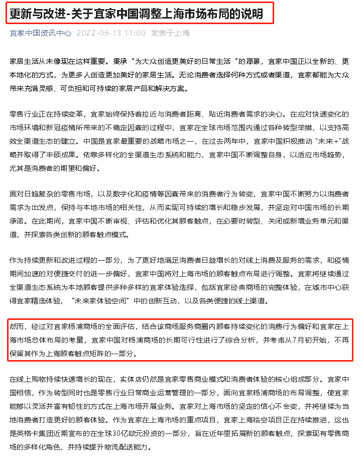 6月13日,宜家中国宣布,将从7月初开始,不再保留宜家杨浦商场作为上海顾客触点矩阵的一部分。值得注意的是上海杨浦店开业仅2年多时间。